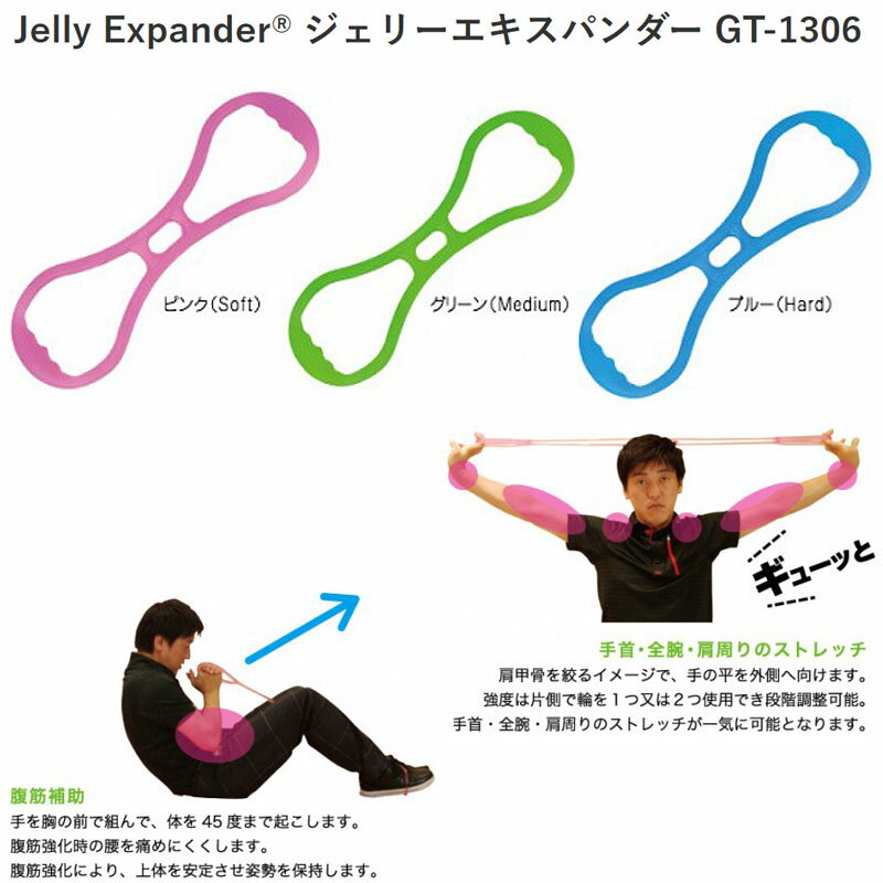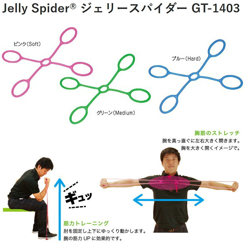 ごるトレ ストレッチ2点セット ジェリースパイダー(Jelly Spider GT-1403) サイズ:最長伸 200 cm ジェーリーエキスパンダー(Jelly Expander GT-1306) サイズ:最長伸 200 cm 素材:TRP カラー:全3色 ピンク(Soft) グリーン(Medium) ブルー(Hard) ※色によって硬さが違いますので、ご自分の体にあうタイプをお選びください。