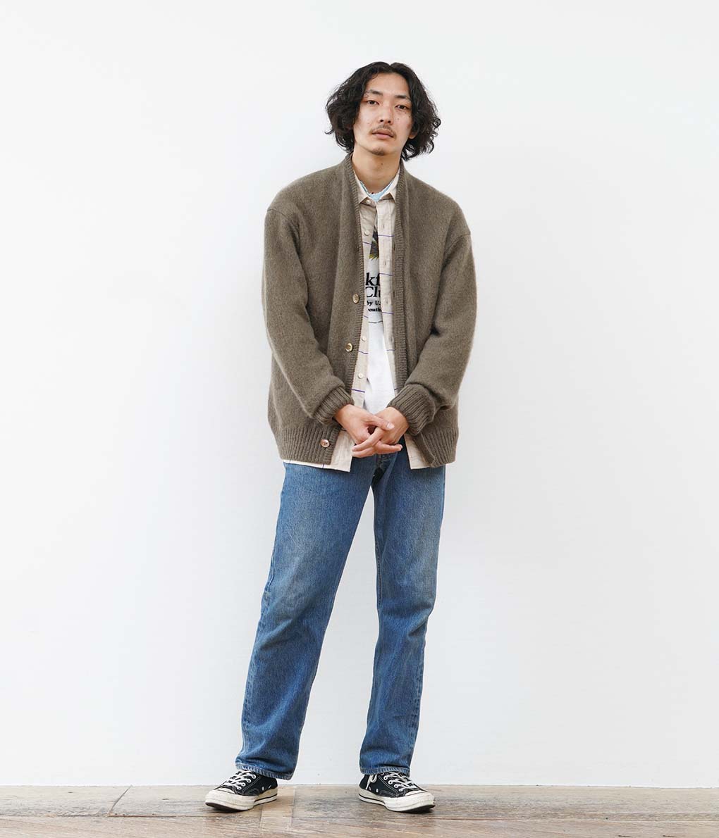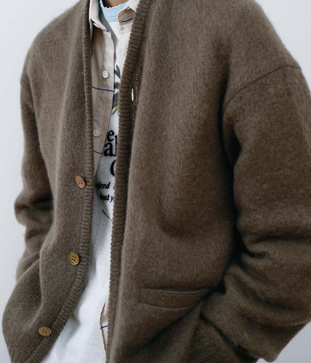 SILHOUETTE レイヤードスタイルが楽しめるVネックカーディガン ゆったりとしたシルエット model(175cm / 55kg)B85 W71 H85 着用サイズ:2 ITEM DESIGN Mohair Cardigan (モヘアカーディガン) 毛足の長いモヘアニットは、着込むほどに風合いが増していき経年変化を楽しむことが出来る MATERIAL 柔らかな肌触りのモヘアニットを使用 毛足の長いモヘアニットは、着込むほどに風合いが増していき経年変化を楽しむことが出来る 全2カラー