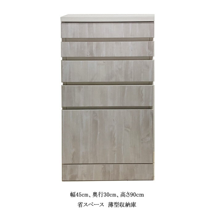 【サイズ】 幅45×奥行30×高さ90cm 重量 16kg 【材質】 強化紙化粧合板/プリント紙化粧板 【備考】 引出し耐荷重 約3kg 引出し 1〜4段目はレールなし、ストッパー付 大引出しのみフルスライドレール付 A4ファイルを立てて収納可能ですヴィンテージ調の薄型収納庫です。