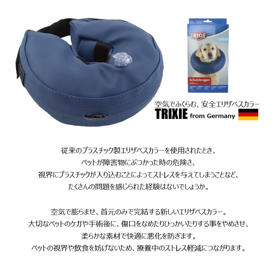 空気を入れ、ふくらませて使用するタイプのエリザベスカラードイツの老舗ペットブランド、TRIXIE(トリクシー)製・表面の汚れはぬるま湯、中性洗剤で洗って頂けます。